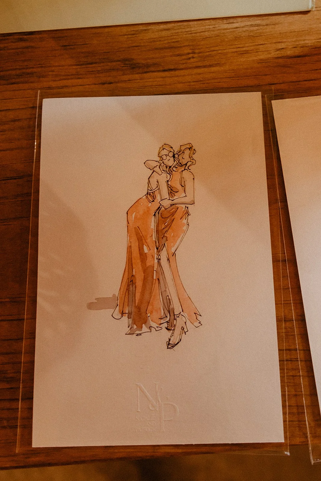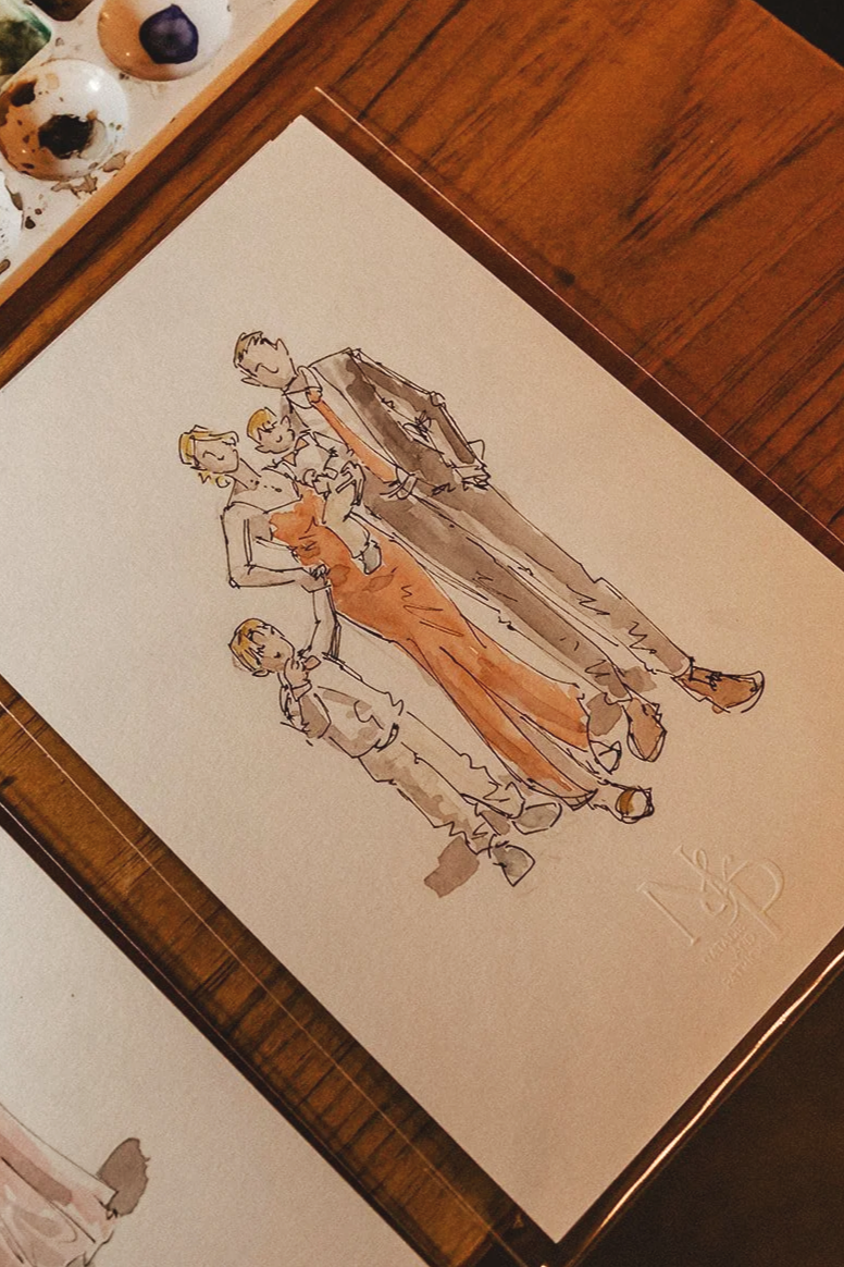 Together, we founded The Live Sketch Co. to merge our creative worlds and bring refined, editorial-inspired ink and watercolor portraits to weddings, offering your guests both an unforgettable experience and a timeless keepsake.