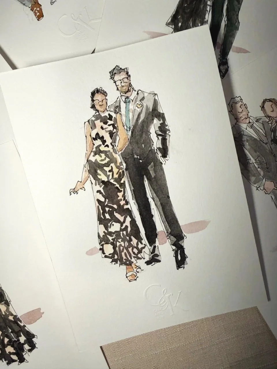 Elevate your guest experience with portraits illustrated in bespoke ink and watercolor. Thoughtfully crafted guest illustrations that offer an elevated, personal keepsake. Each piece reflects your celebration with an editorial, fine-art touch, perfect for modern New England weddings.